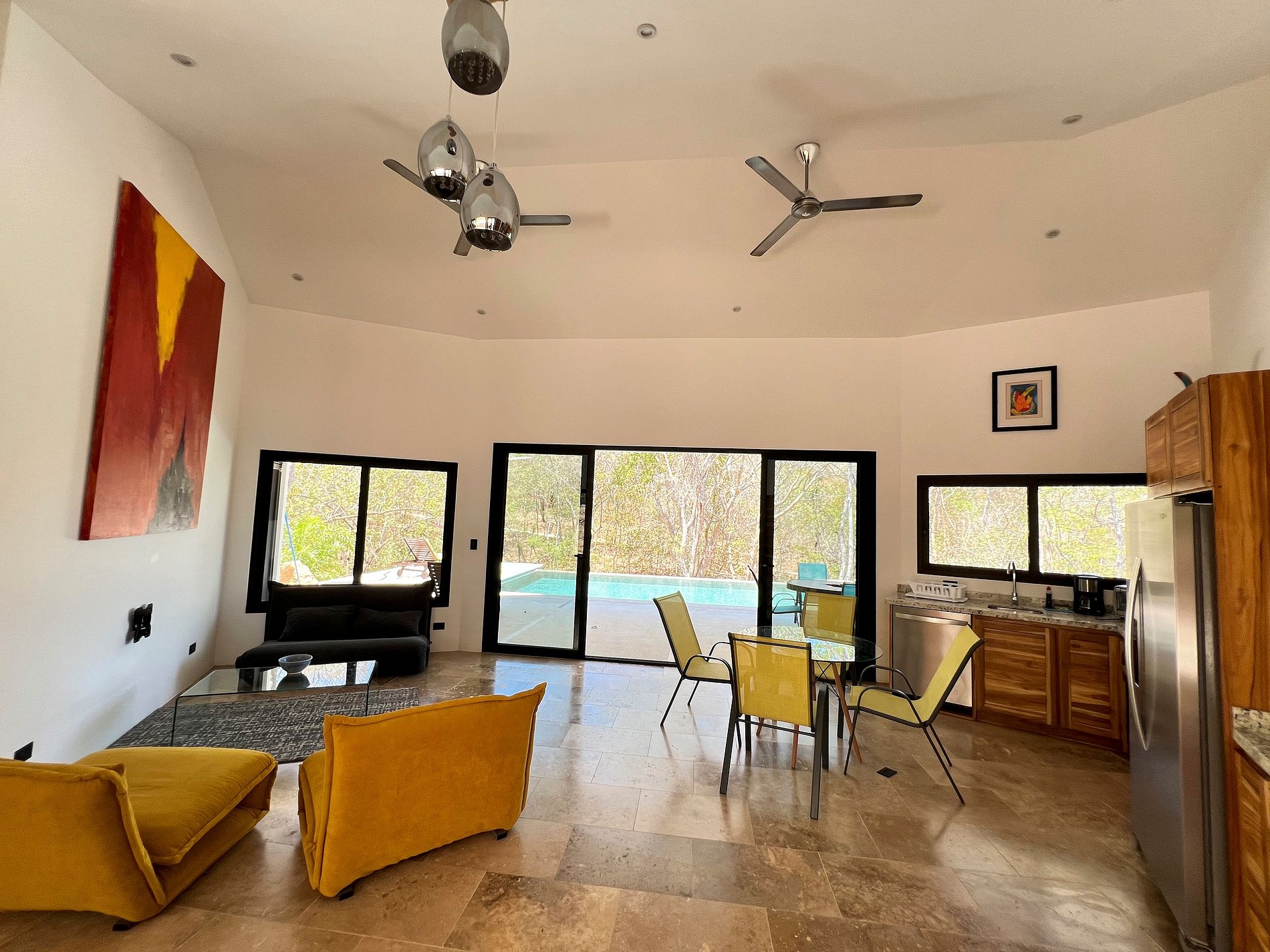 Guests have full access to the villa, including the private pool, kitchen, bedrooms, bathrooms, gardens, and outdoor areas. Important: Music is allowed until 10:00 p.m. out of respect for neighbors. Transportation: A 4x4 vehicle is recommended, especially during the rainy season. Access is mostly paved, with some gravel sections. We can assist with car rental arrangements. There is no public transportation. Informal taxis are available by reservation (advance planning is recommended). Liberia International Airport: 2.5 hours. San José (SJO) Airport: 1.5 hours via ferry.