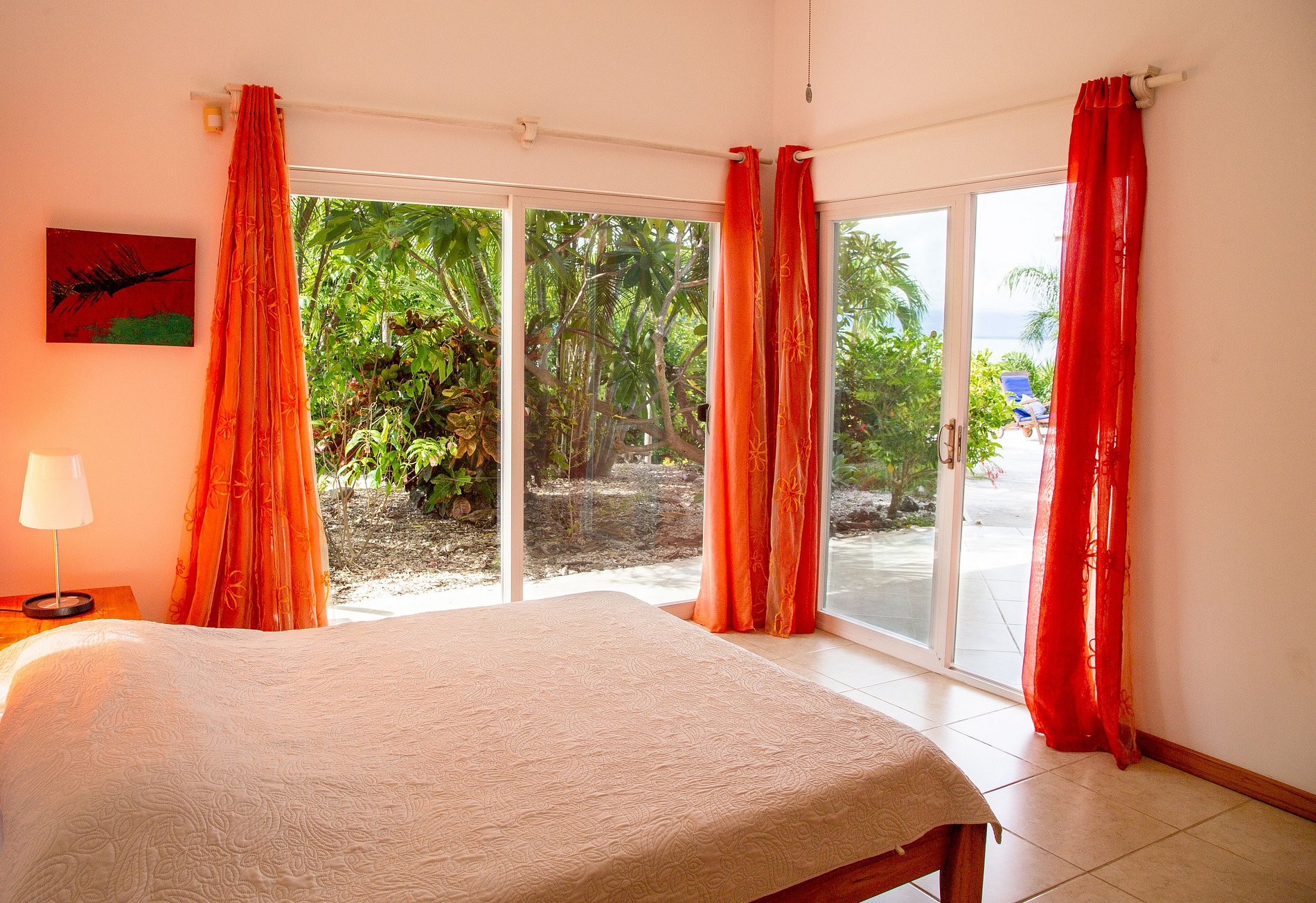 Villa muy cómoda y privada con 3 habitaciones con aire acondicionado y 2.5 baños, y una habitación externa con baño completo. Tiene una cama king en el cuarto principal, una cama queen en en segundo cuarto tercer cuarto. Opción de alquilar una habitación con baño en el exterior por un costo extra. Incluye comodidades como smart TV, internet, y una cocina completamente equipada con todos lo esencial. Las puertas corredizas llevan a una piscina infinita privada con hermosas vistas a las islas.