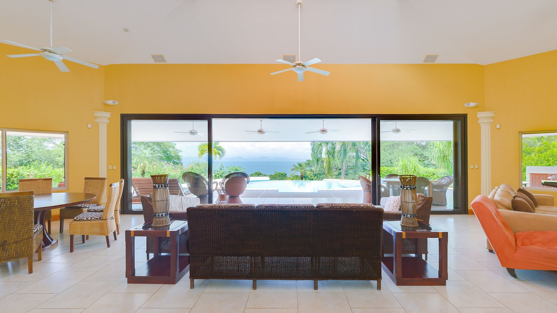 Villa muy cómoda y privada con 4 habitaciones y 2.5 baños. Cuenta con una cama king en el cuarto principal, una cama queen en el segundo y tercer cuarto y dos camas individuales en el cuarto restante. Incluye smart TV, internet y una cocina completamente equipada, además de un rancho con BBQ. Las puertas corredizas conducen a una piscina infinita privada con vistas a las islas.