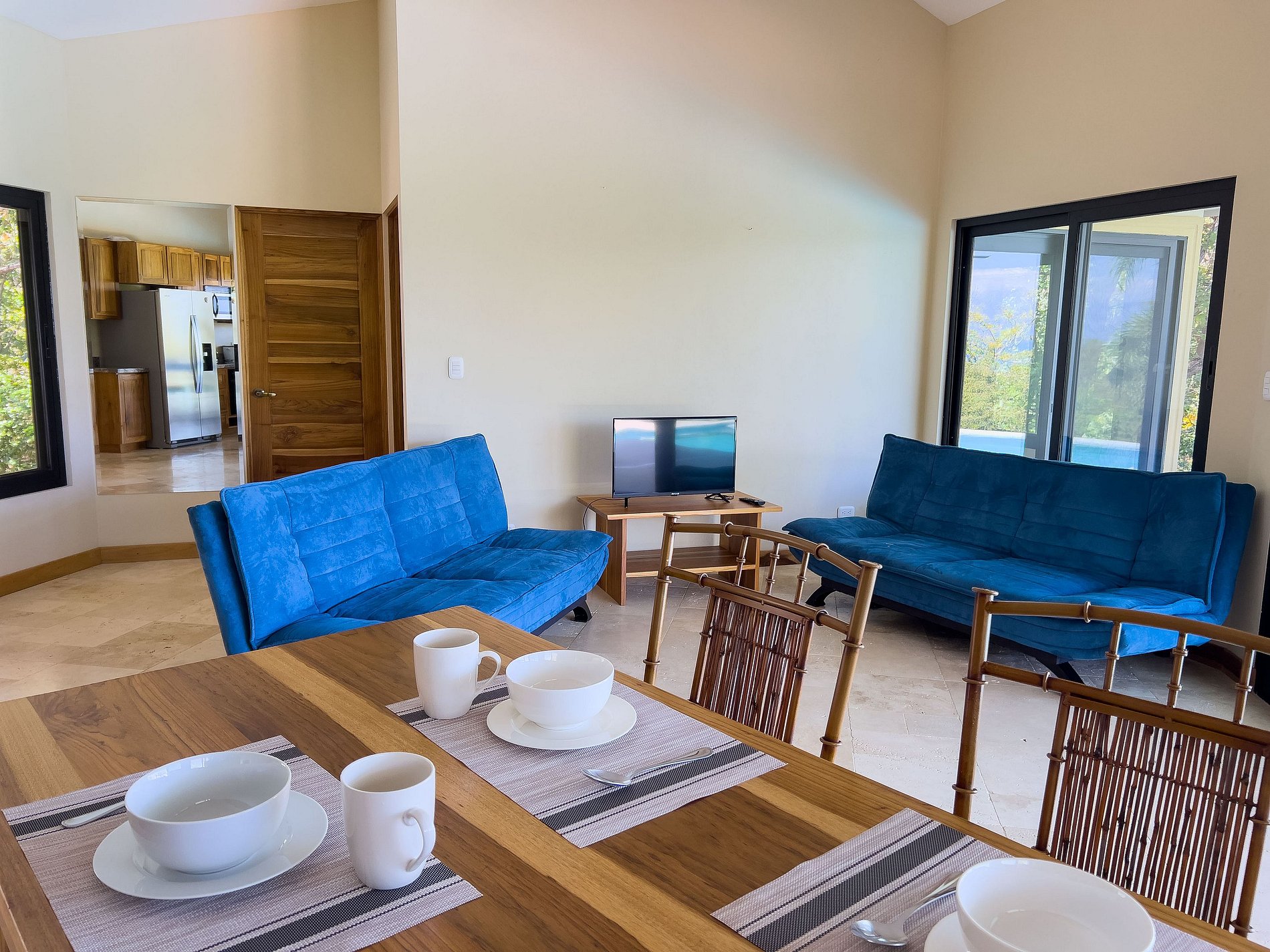 Villa muy cómoda y privada con 2 habitaciones con aire acondicionado, 2 baños completos y un walk-in closet en la habitación principal. Hay dos sofá cama en la sala. Cuenta con una cama king en cada habitación. El espacio incluye comodidades como un smart TV, internet de alta velocidad y una cocina completamente equipada con todos los electrodomésticos esenciales. Las puertas corredizas conducen a una piscina infinita privada con hermosas vistas al bosque.